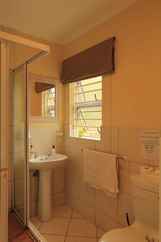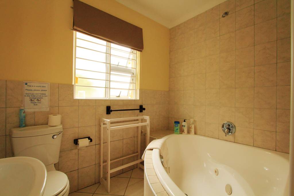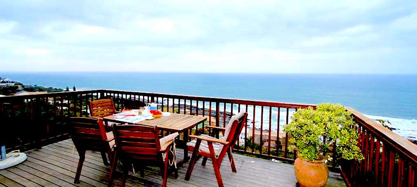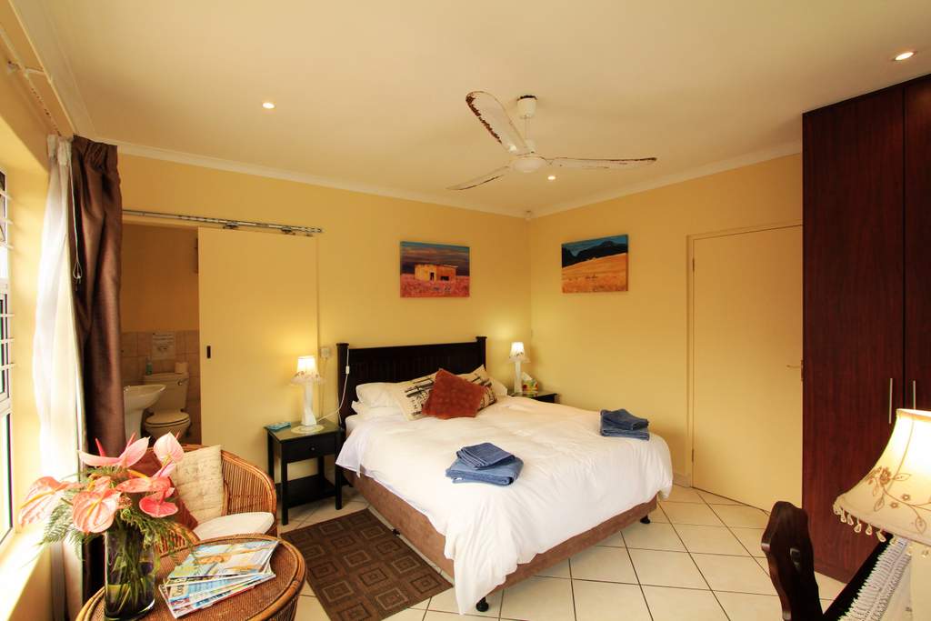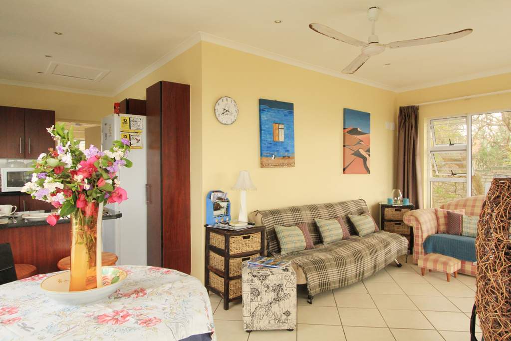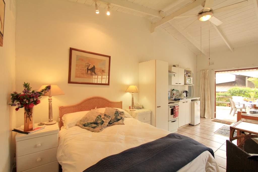 Self-catering garden cottage it is a studio with a double bed and bunk beds so will suit a small family or a couple there is a small kitchen, full bath and shower and very pleasant terrace with table and chairs and braai but NO sea view this is affordable accommodation!